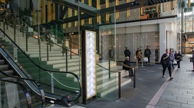 商業(yè)灣是奧克蘭海濱新的世界級零售區(qū),以辦公、國際知名零售、公共空間和高端酒店為特色?;诨旌嫌猛镜纳虡I(yè)灣,設(shè)計團隊將建筑元素提取出來設(shè)計了凹槽玻璃、木框架和鋼支撐結(jié)構(gòu)的復合式標牌。地板上的V 形字圖案被嵌入在標牌內(nèi)作為照明燈光,采用Avante Garde哥特式字體,具有懷舊感和易讀性。整套導視系統(tǒng)的精心設(shè)計不僅有助于人們導航,指引方向,還彰顯了藝術(shù)性,提升了環(huán)境美感。