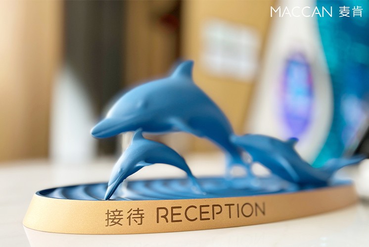 標識牌海豚標識造型以大海深藍為主色調,擁有特征鮮明的外光輪廓,圓潤飽滿的線條,海豚越出水面的身體,矯健有力,極具辨識度和未來感,突出人與自然交融共生的理念,融入了多種看得見的“海平面”、“水波紋”等海洋元素,讓人為之眼前一亮。