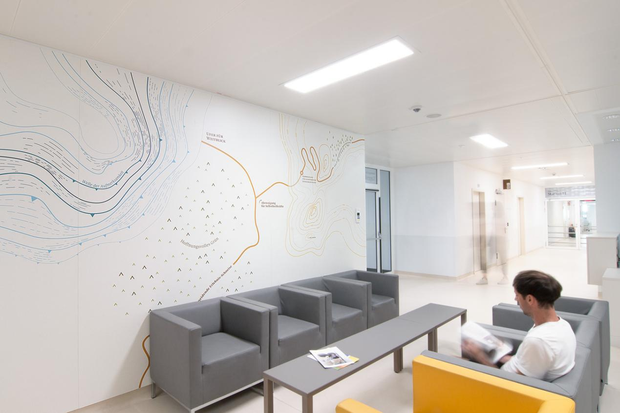 圣約瑟夫醫(yī)院位于奧地利維也納,是一家基督教醫(yī)院,以溫暖和個(gè)人關(guān)注而聞名。醫(yī)院標(biāo)識(shí)設(shè)計(jì)定制了地圖圖像和文本相結(jié)合的信息傳達(dá)個(gè)性化區(qū)域,高山、海洋景觀、空氣和水流地圖交替出現(xiàn),為就診環(huán)境增添了溫暖的氣氛。功能引導(dǎo)性標(biāo)牌以清晰、無(wú)障礙和布局清晰的方式呈現(xiàn),直接與插圖信息相關(guān)聯(lián),保證了目的地的直觀定位。