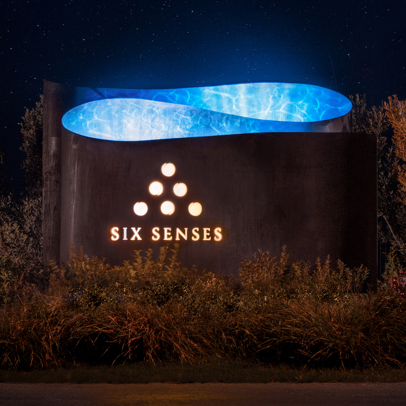 基于酒店名Six Senses,F(xiàn)ederation設計機構設計了六個簡約的不規(guī)則圓點logo,象征著六種感覺。精神堡壘為流暢的立體折面,在內部設計了藍色的氛圍燈光,具有神秘感。戶外立式導視板由不規(guī)則木材和石材結合,擁有彎曲的線條,特別的是,在連接處設計了燈光照明,具有裝飾作用。室內采用較厚的圓角方形木材和石材相結合,具有厚重感,配色溫和,打造了優(yōu)雅的酒店環(huán)境。