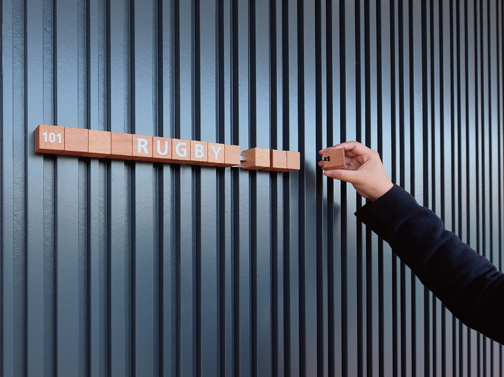 該俱樂部帶有看臺,可觀看操場賽事,清水公司將建筑配色融入到標(biāo)牌設(shè)計中,采用以橙色為主的配色方案,多彩的環(huán)境色彩打造了活潑、溫暖的空間。標(biāo)牌采用紅雪松材質(zhì),呼應(yīng)配色方案,模塊化的組件可用于信息更替。