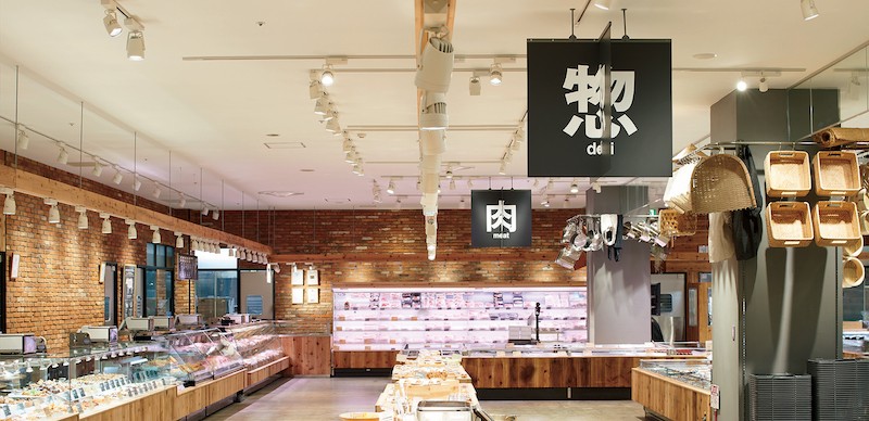 NIPPONDESIGN CENTER設(shè)計了兩種顏色的標(biāo)牌,將商店內(nèi)部分為普通銷售區(qū)域和生鮮食品銷售區(qū)域,紅色代表普通銷售區(qū)域,深灰色代表生鮮食品銷售區(qū)域,而收銀區(qū)則用白色標(biāo)牌。所有標(biāo)牌雖然只用一個字表示,但信息傳達度卻很高,刪繁就簡的方式利于信息傳達。特別的是,將其改造成一個交叉懸掛的標(biāo)志,便于從各角度觀看,消除了盲區(qū),使整個商場變得簡潔明了。
