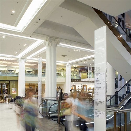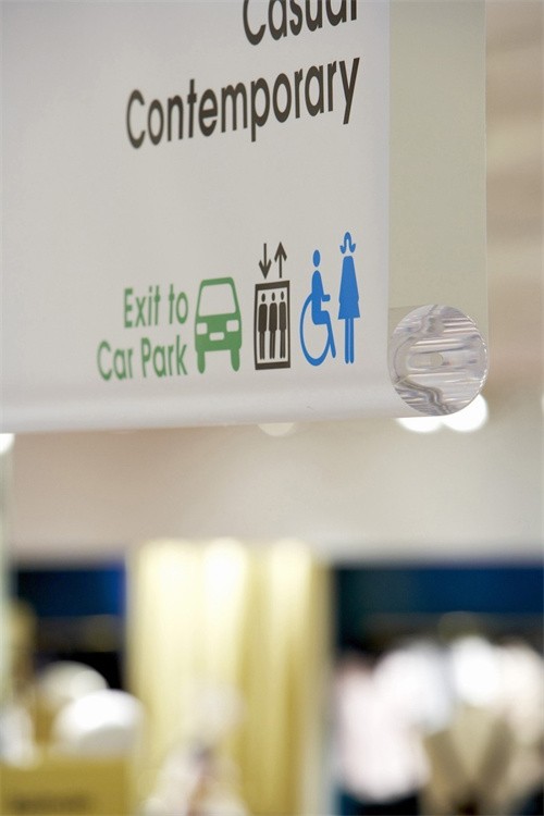有人說,標識是建筑的耳環(huán)。標識和環(huán)境中的其他裝置相比,其體量不大,數(shù)量卻不小,所以小小的標識對于商業(yè)空間的影響卻是巨大的,當人們處于一個龐大的商業(yè)空間環(huán)境時,由于對環(huán)境的不熟悉,常會表現(xiàn)出強烈的慌亂感,一種方法是事先通過了解平面功能分布圖,另一方面是動態(tài)的導向,在進行過程中根據(jù)周圍環(huán)境的暗示和引導不斷地調(diào)整行走路線和方向。