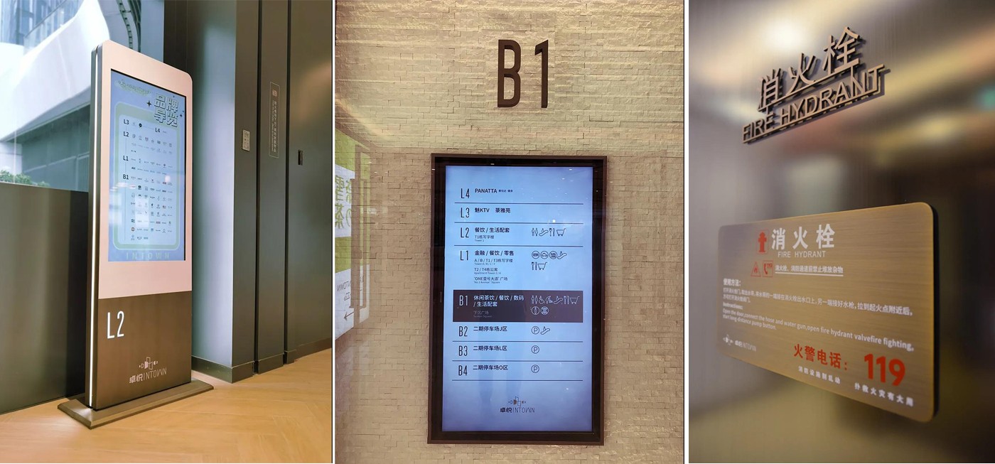 區(qū)別于傳統(tǒng)的MALL, INTOWN倡導(dǎo)“精享·慢活”,在區(qū)域中營(yíng)造了街區(qū)感,商戶(hù)分散錯(cuò)落有致,品牌展示空間大而華麗,讓人在其中會(huì)有被時(shí)尚全方位包圍的時(shí)尚空間感。麥肯通過(guò)實(shí)地勘察研究,專(zhuān)業(yè)規(guī)劃設(shè)計(jì)了一整套標(biāo)識(shí)導(dǎo)視系統(tǒng)裝置。