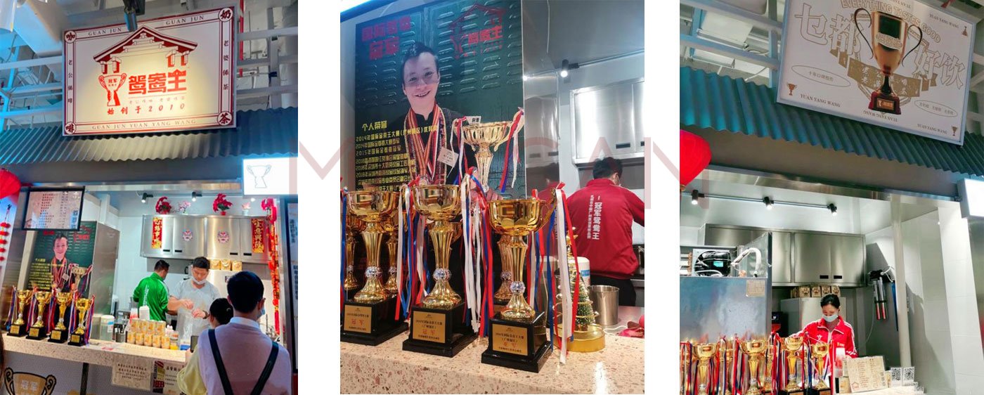 鴛鴦王冠軍奶茶和冠軍鴛鴦,曾獲得多個奶茶大獎。永慶坊店招牌由麥肯打造,走進荔枝食集,遠遠就看到鴛鴦王店鋪臺面上一排排金燦燦的獎杯,一看就是技術(shù)含量高的狠角色,店招充滿濃濃的復(fù)古港風。